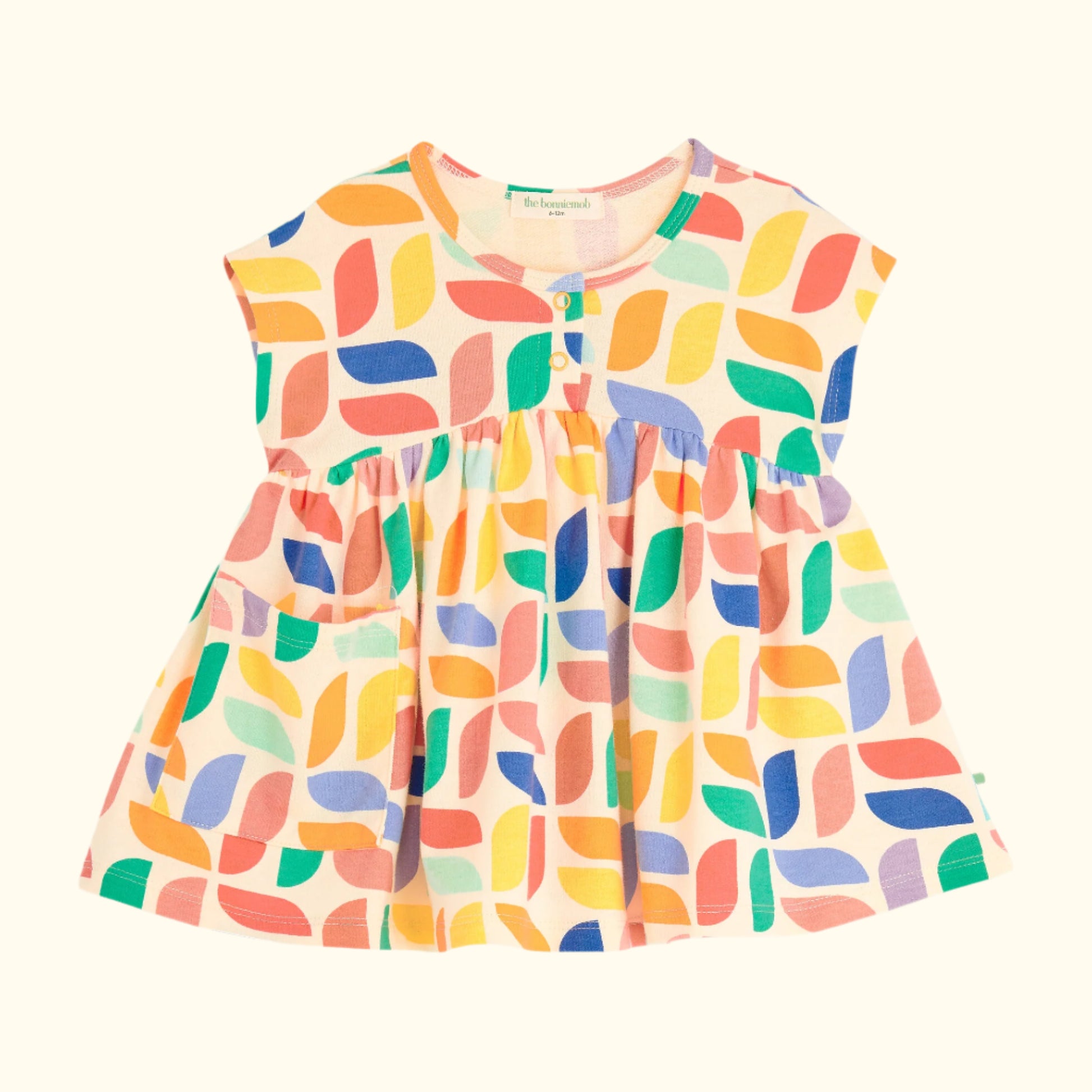 Fustani MILENA është një përqafim shumëngjyrësh për ditët e ngrohta. Me mëngë të shkurtra dhe një prerje të lirshme që e bën ideale për lëvizje të lirë, është veshja perfekte për të dalë jashtë e për të luajtur. Ngjyrat Kaleidoscope i japin një ndjesi gëzimi çdo hapi të vogëlushes.