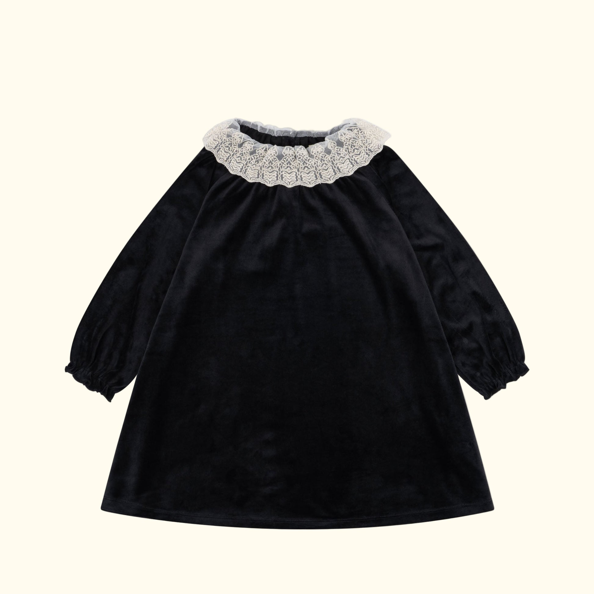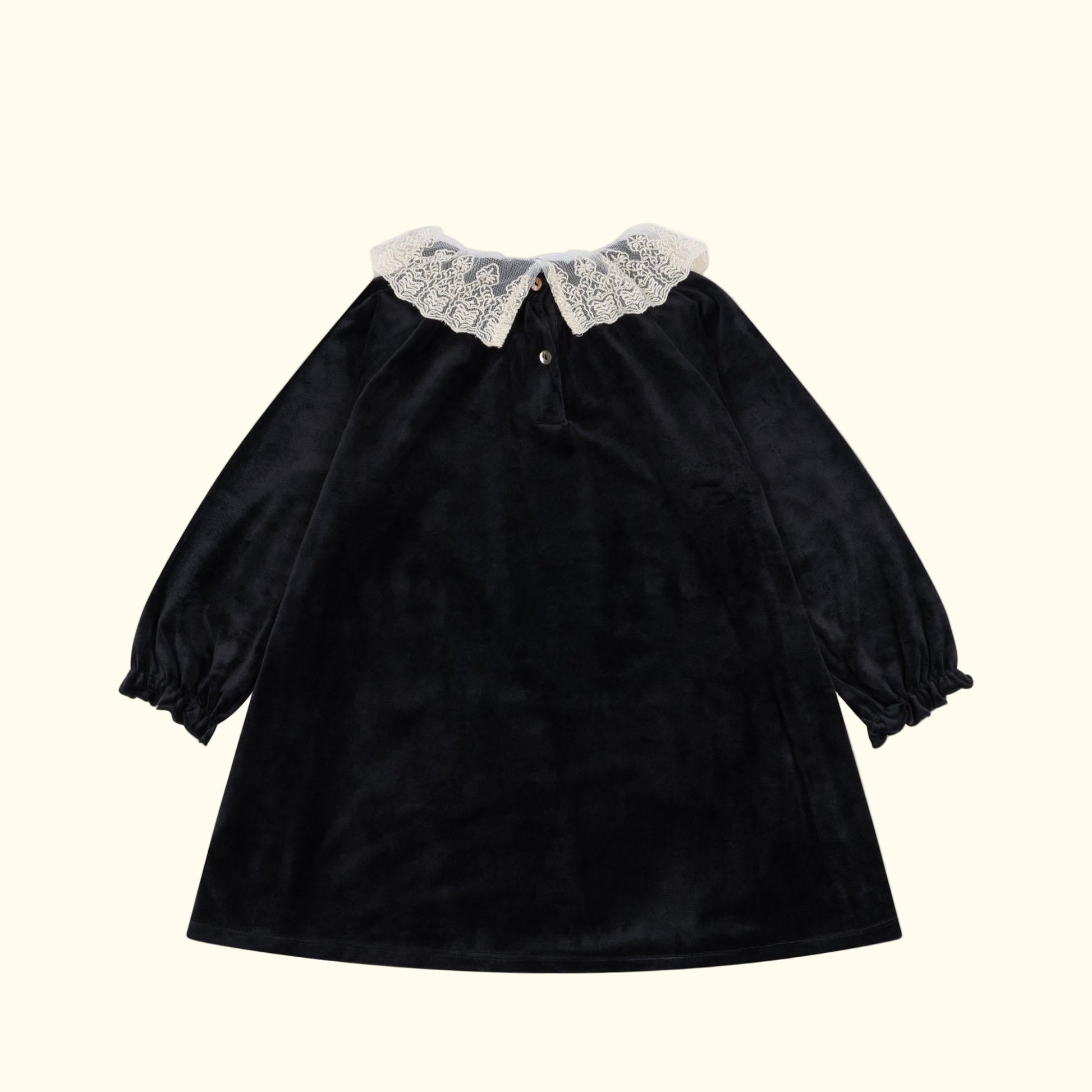 Fustan velvet i zi me jakë të bardhë nga Konges Slojd, perfekt për festat e nëntorit ose të fundvitit.