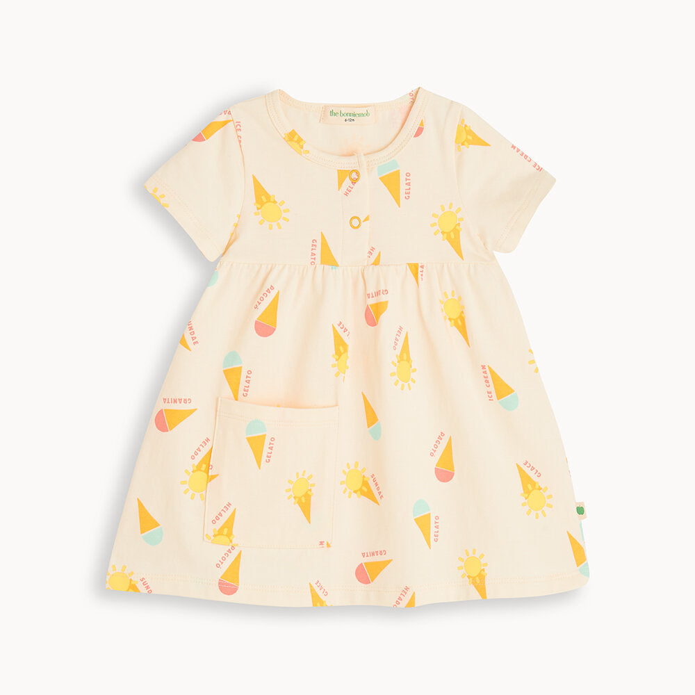 Fustani SPRINKLES është një kombinim perfekt i rehatisë, butësisë dhe lojës së ngjyrave. Me një prerje të lirshme dhe mëngë të shkurtra, është krijuar për ditët e ngrohta të verës ku çdo hap shoqërohet nga buzëqeshje. Printi “Gelato” sjell ëmbëlsi akulloresh dhe pushimesh, ndërsa “Postcard” sjell atmosferën e udhëtimeve dhe aventurave të para. Një fustan i lehtë që përcjell ndjesinë e fëmijërisë së lirë dhe të gëzueshme.