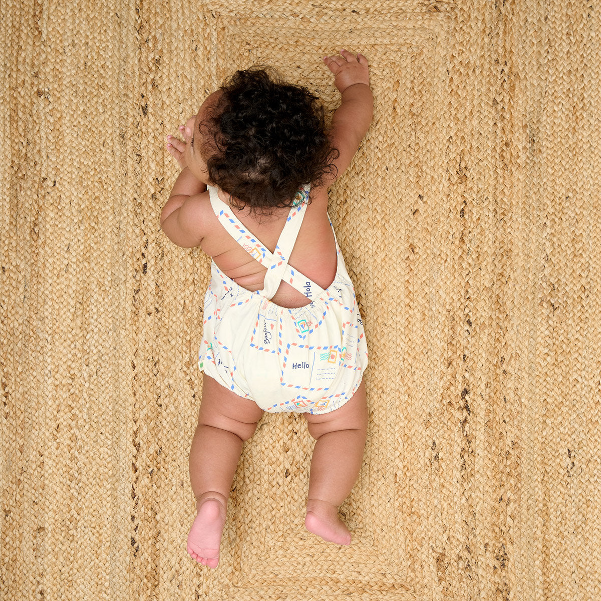 Kominoshet SCOOTER janë një nga kominoshet më lozonjare të koleksionit. Me formën “bubble” që i jep një pamje të rrumbullakosur dhe të ëmbël trupit të vogëlushit, kjo veshje është ideale për ditët e nxehta. Printi “Postcard” sjell aromën e pushimeve dhe momenteve të para të zbuluara nga një fëmijëri e lumtur. Materiali i butë siguron rehati gjatë gjithë ditës, ndërsa mbylljet praktike e bëjnë të lehtë për t’u veshur.